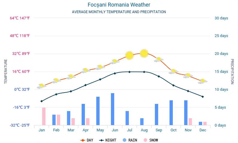 Pe teritoriul Municipiului Focșani, clima este temperat continentală, influențată de adăpostul Carpaților de Curbură, cu variații mari de temperatură.